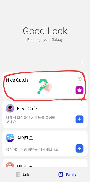 1. Galaxy Store 에서 Good Lock 을 받아서 설치한다. (Play 스토어에는 없음) 2. Family 탭에서 Nice Catch 를 설치한다. |